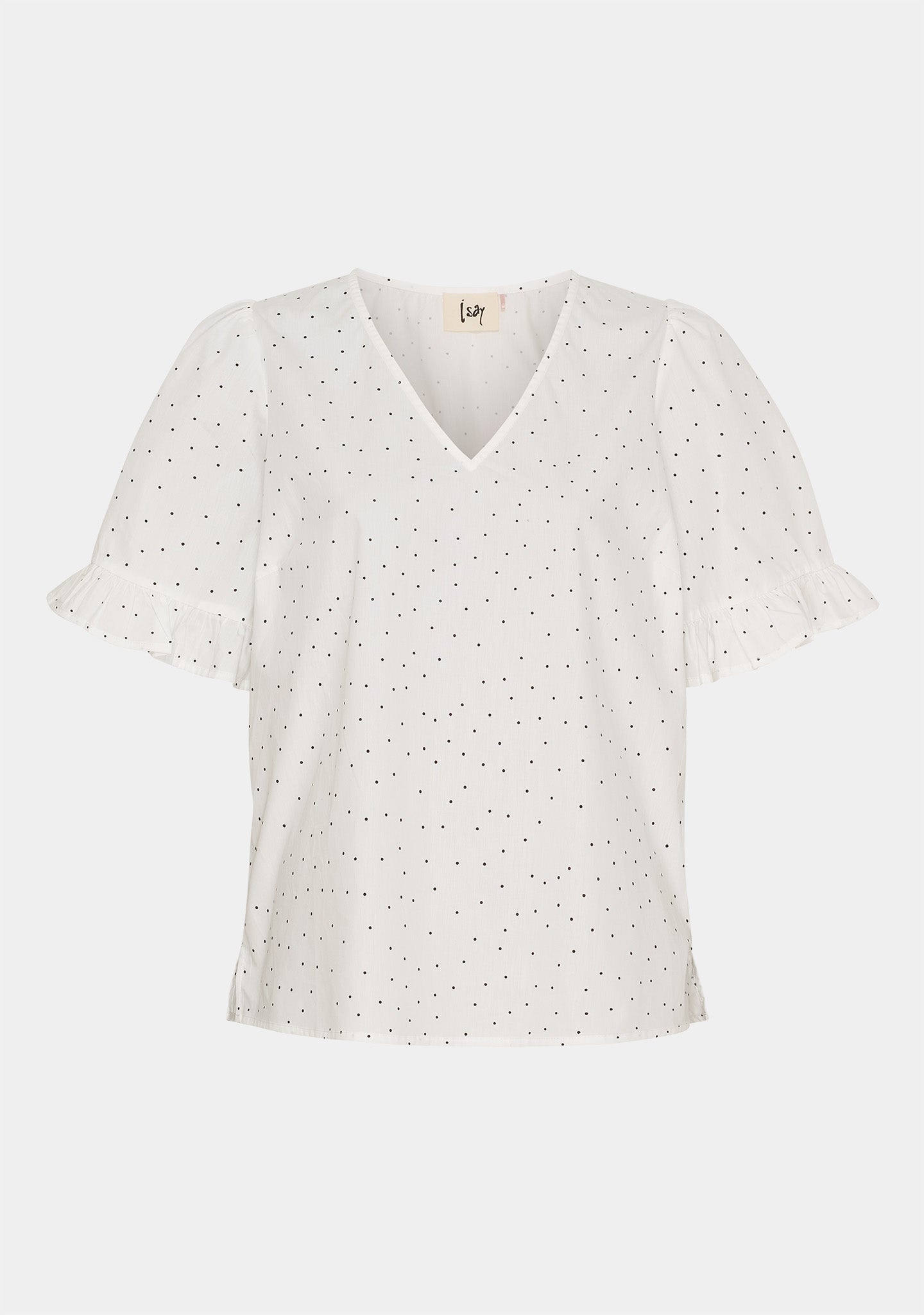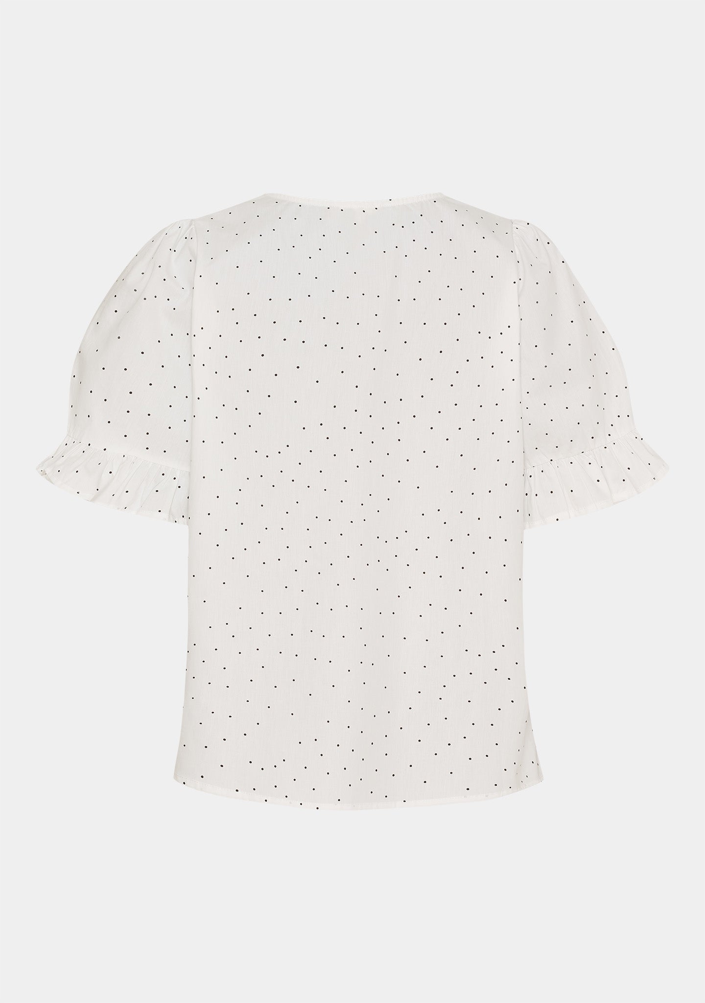 The Molly Blouse is a lightweight and feminine summer blouse with a graphic, subtle expression. The fine cotton quality is lightly transparent and decorated with small tonal dots, giving the surface a subtle texture without drawing attention. The fabric has a light firmness, which makes it drape nicely and hold its shape while feeling light on the body.