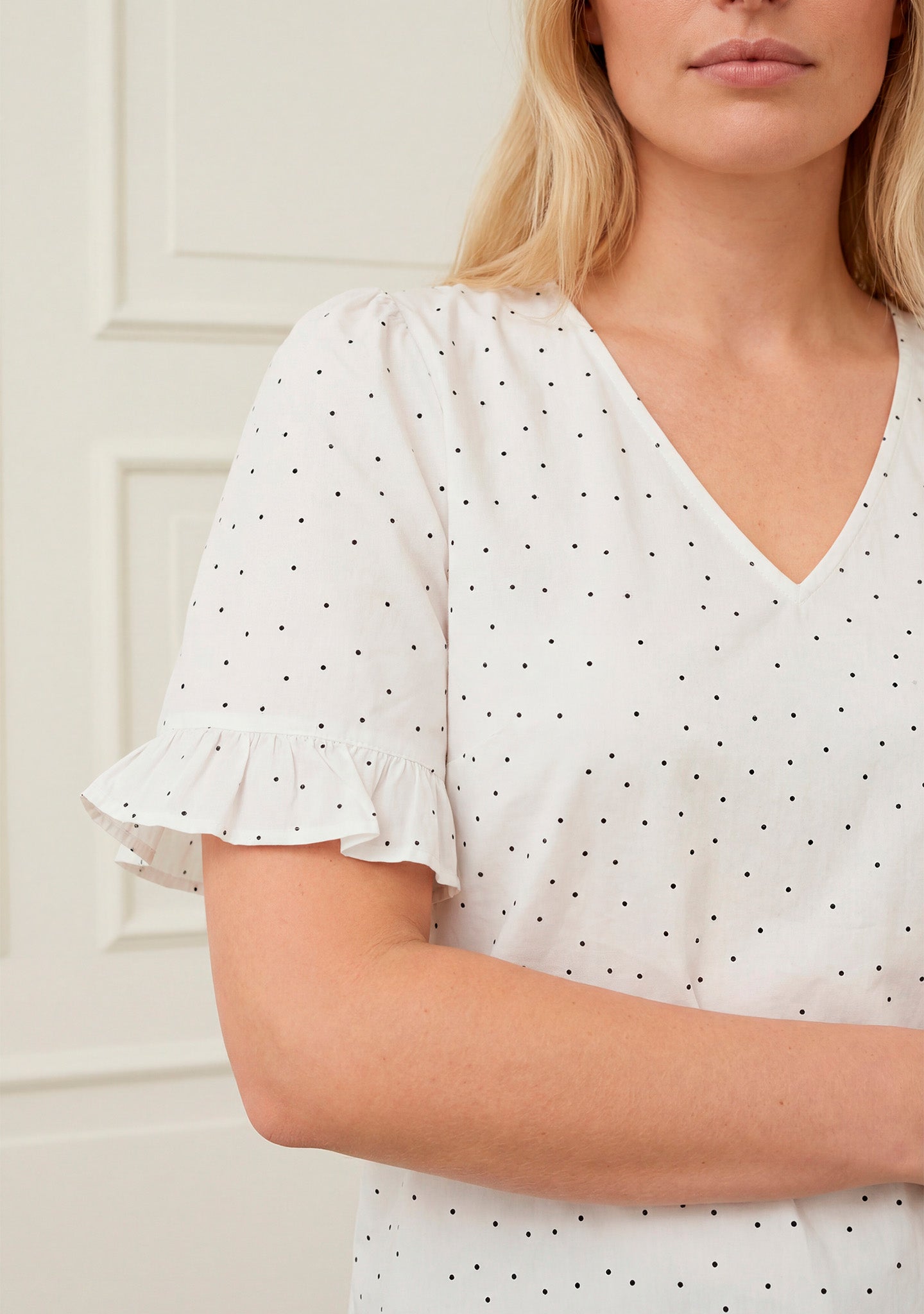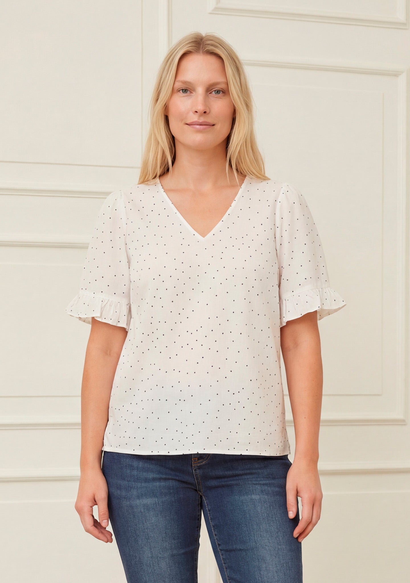 The V-neck gently opens at the neckline, and the short sleeves with ruffle edge add movement and a feminine touch. The fit is relaxed and straight, making it easy to style both loose and lightly tucked into pants or a skirt.