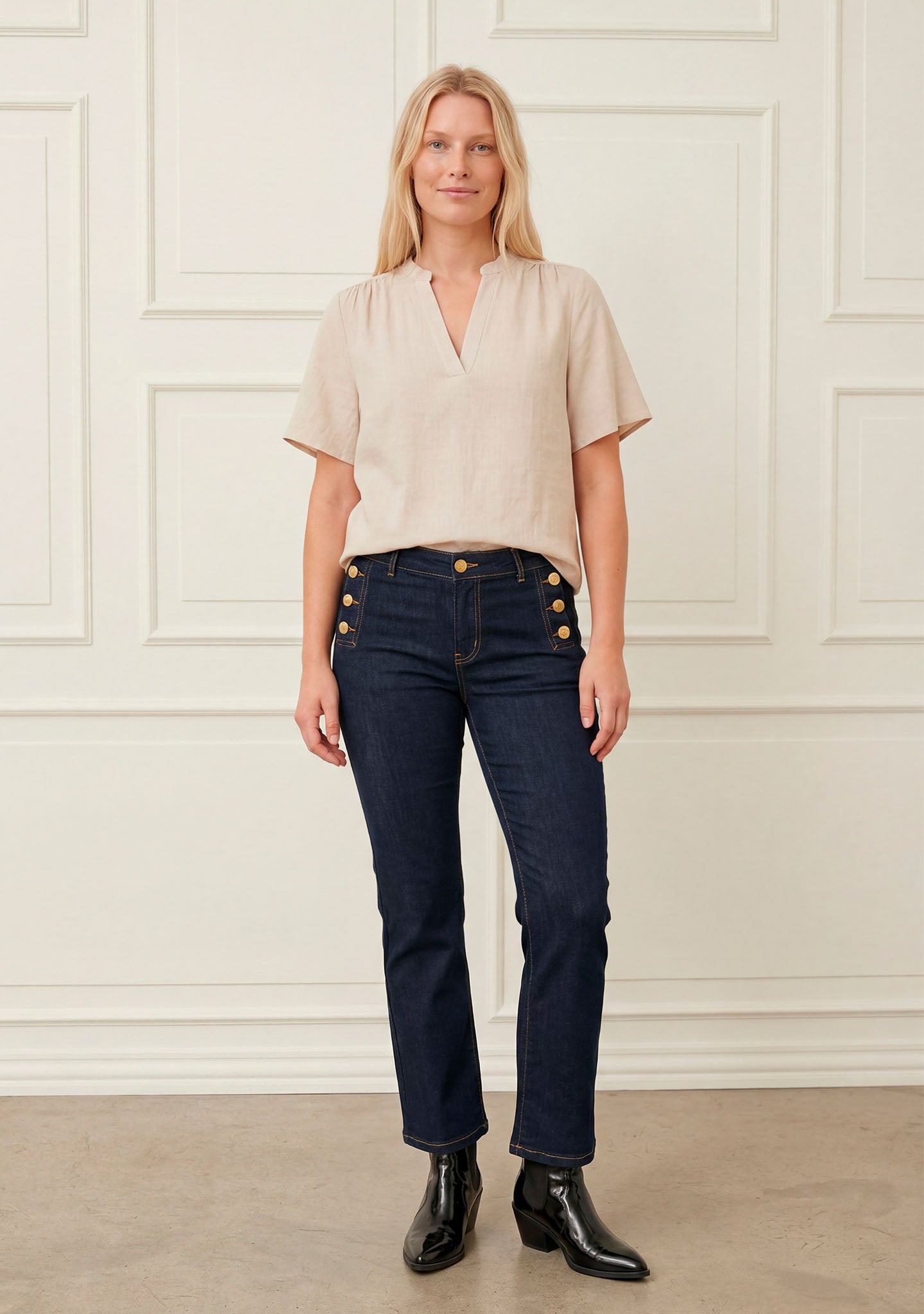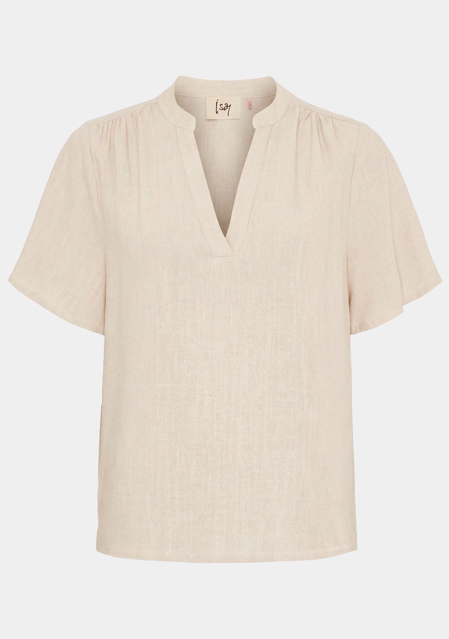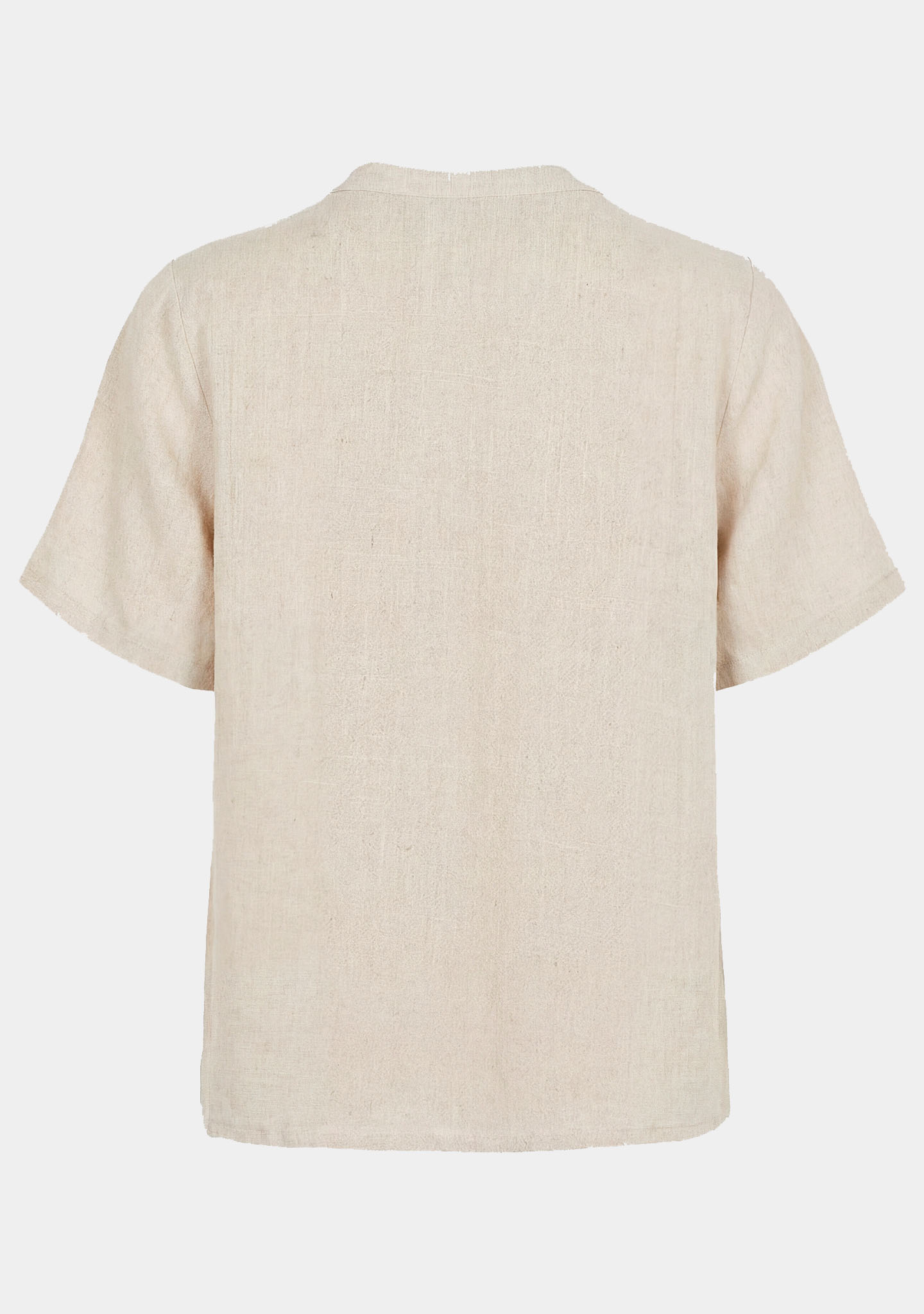 The small stand-up collar and the open V-neckline give a clean and feminine look, while the fine pleats at the shoulders add a discreet detail that elevates the whole. The sleeves have a slight width, so they fall nicely and give a relaxed, airy expression. The material is a beautiful blend of linen and viscose. You get the characteristic linen structure and the natural, vibrant surface - combined with the softness and drape of viscose. It feels light and breathable against the skin and is perfect for warm days.