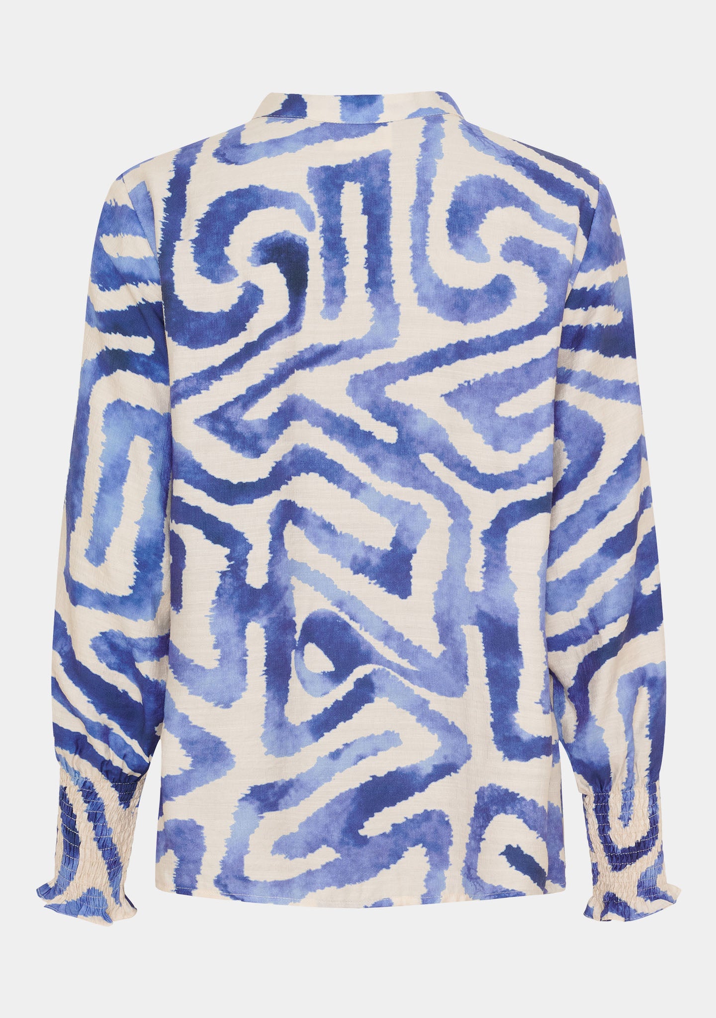 Ane Printed Blouse is an elegant blouse with a modern print and beautiful, feminine details. The small stand-up collar has gentle ruching, giving a soft look, while the button placket in front is decorated with fine pleats, creating extra structure. The sleeves end with elastic smocking, providing both comfort and a refined finish. The fit is loose, making the blouse comfortable to wear all day. Made in a soft viscose blend with polyamide, it falls nicely and feels light against the skin.