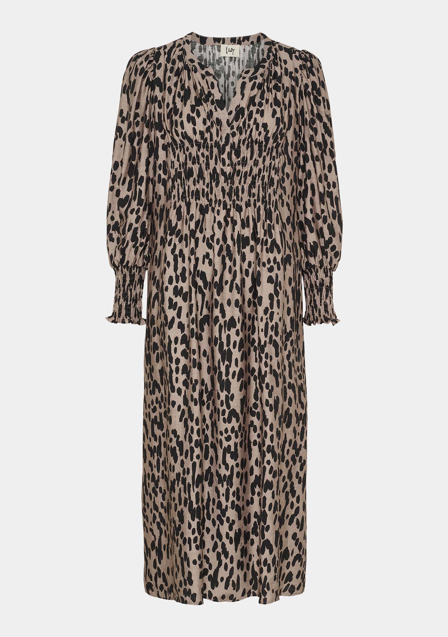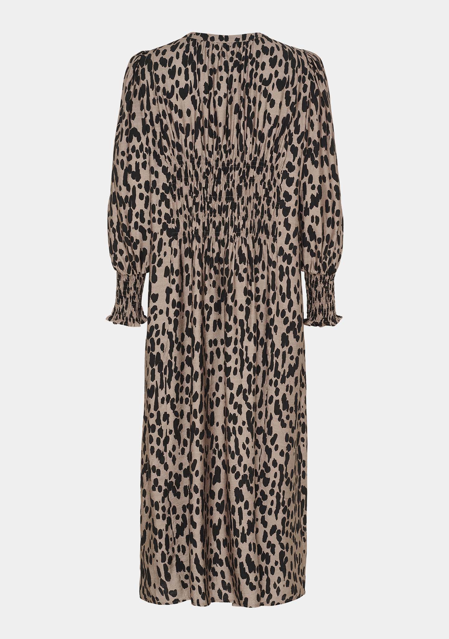 The V-shaped button closure opens up beautifully, while the smock details in front and back provide shape and flexibility. The sleeves end with smock, creating a soft volume and holding the fit in place.