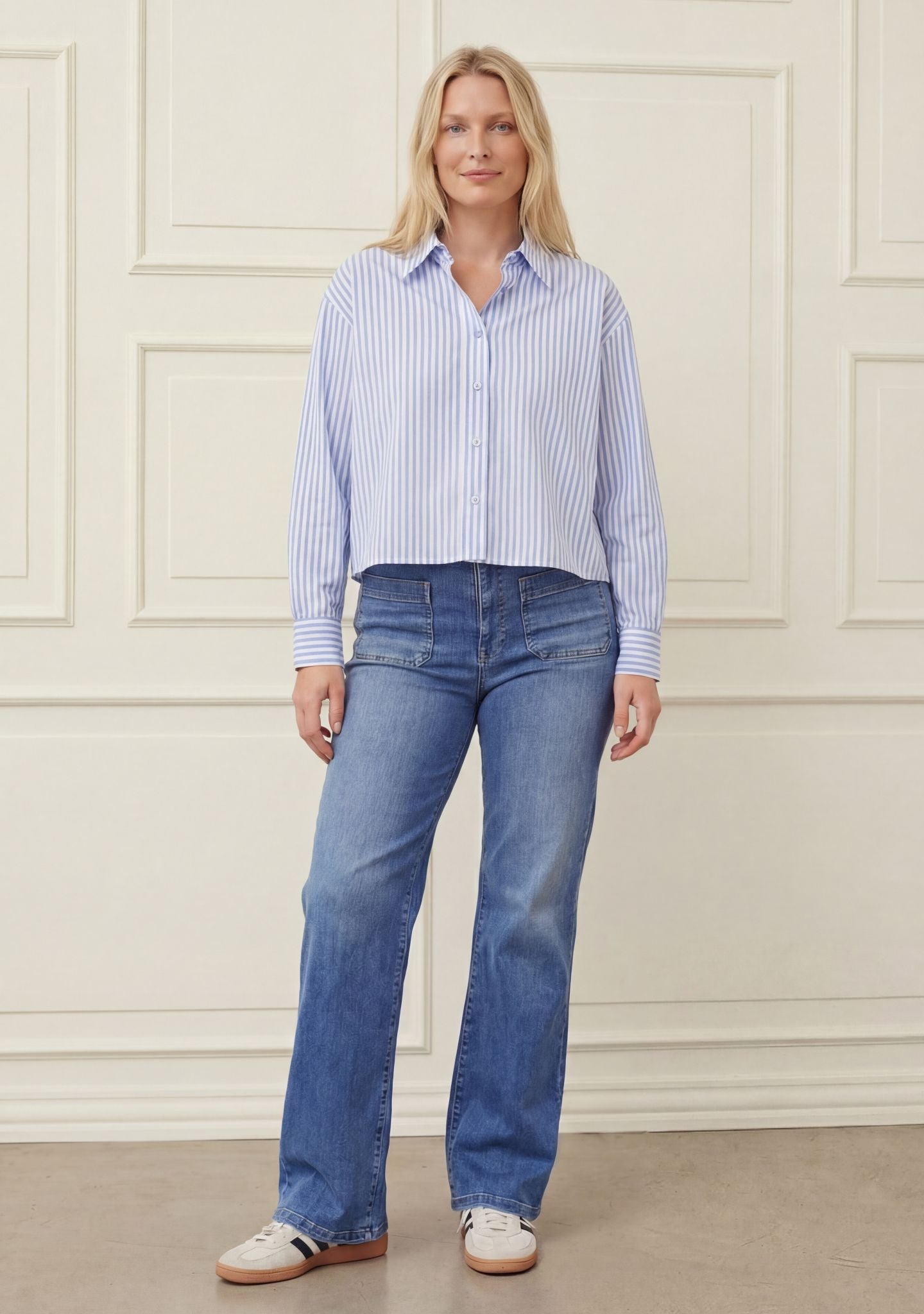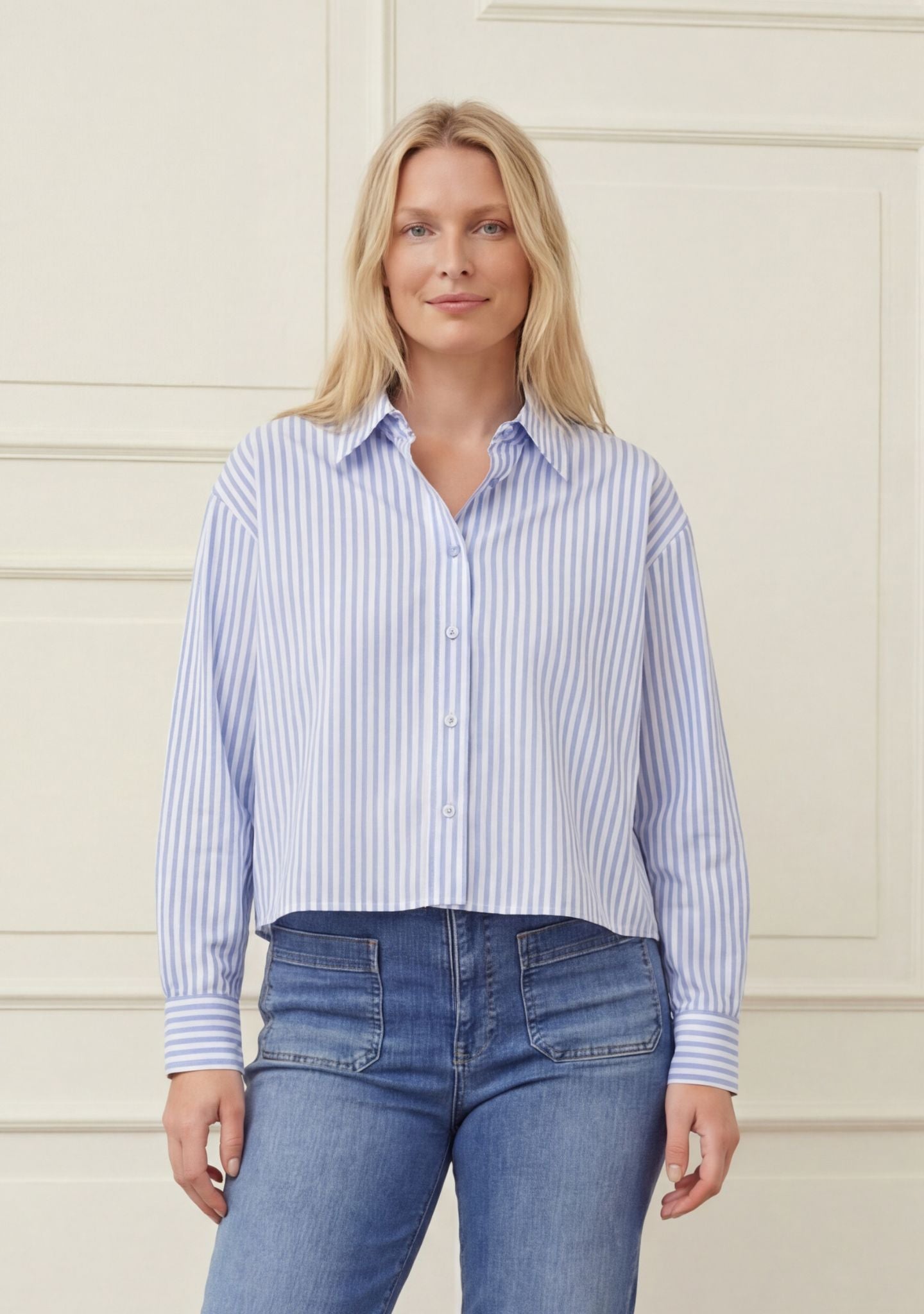 It carries the clean, classic look of a striped shirt - but with a little more structure and hold, so it also functions as a lightweight jacket. Wear it open over a top, buttoned up as a shirt, or draped over your shoulders when the weather can't quite make up its mind.