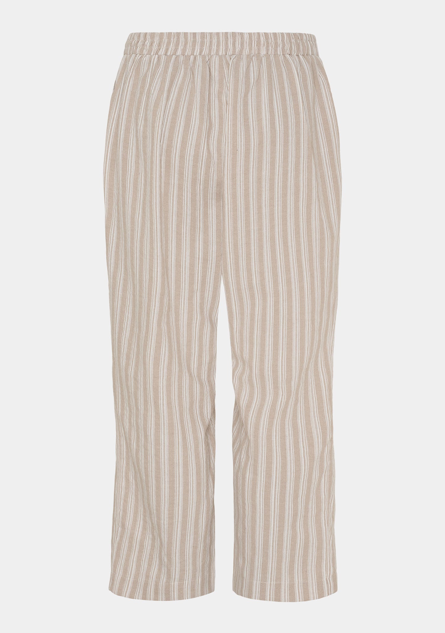 The quality is pure cotton and relatively thin, making them airy but also slightly see-through. Therefore, we recommend avoiding dark underwear. The cropped length gives a light and relaxed look, and the fine stripes make them easy to style with both a simple top or a loose shirt.