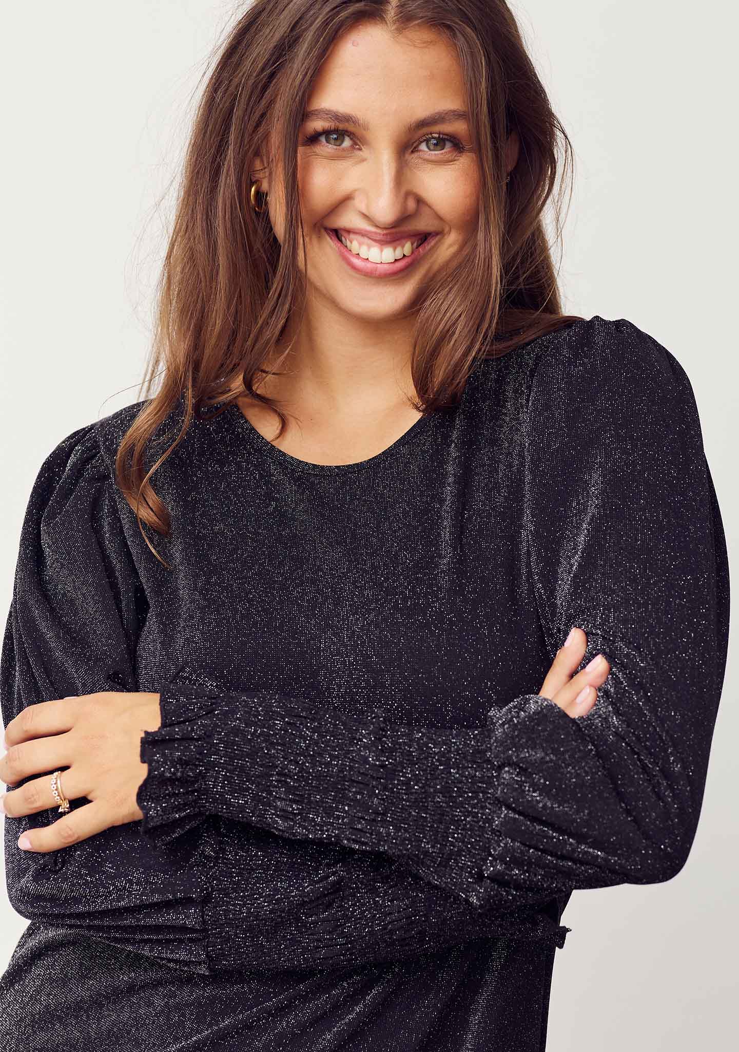 It has a round neck, a lightly A-line cut, and long balloon sleeves with smock and a small flounce trim, adding a feminine touch. The fit is comfortable and spacious enough for you to move freely - whether you're dancing, working, or just want to feel comfortable all evening.