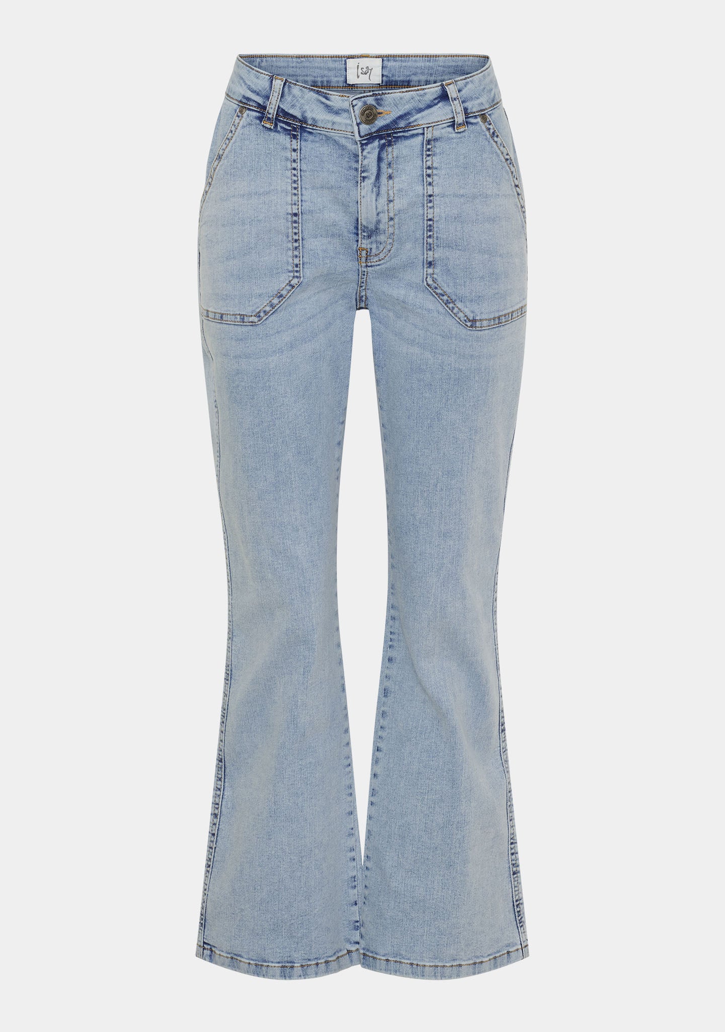 Super stylish, 80s-inspired jeans. Designed in a flare-leg fit, also known as bootcut, with a medium waist and made in delicious cotton. The distinctive feature of Como Flare Jeans is that they are snug from the hips to the knees and then have a wide width at the pant legs as well as a nice flair. These jeans have a fixed lining with belt loops, two large slanted front pockets, and two back pockets with cool details. There is also a zip fly with a button closure at the top. With Como Flare Jeans, you get a pair of retro and well-proportioned jeans for women that stand out with the beautiful jean stitching and wash. Comfort is top-notch with these jeans, and you'll love wearing them all day. For a raw look, you can pair them with a fitted blouse or a shirt along with a pair of stylish boots.